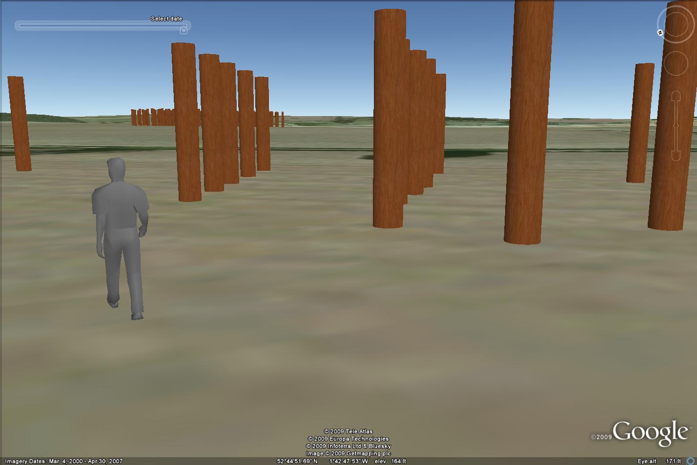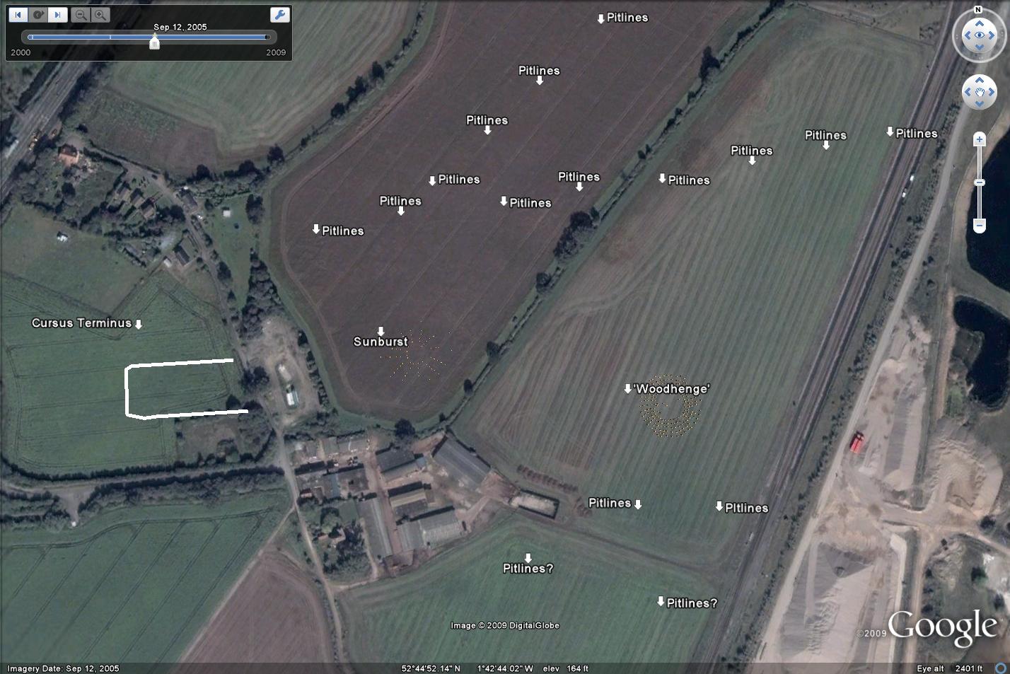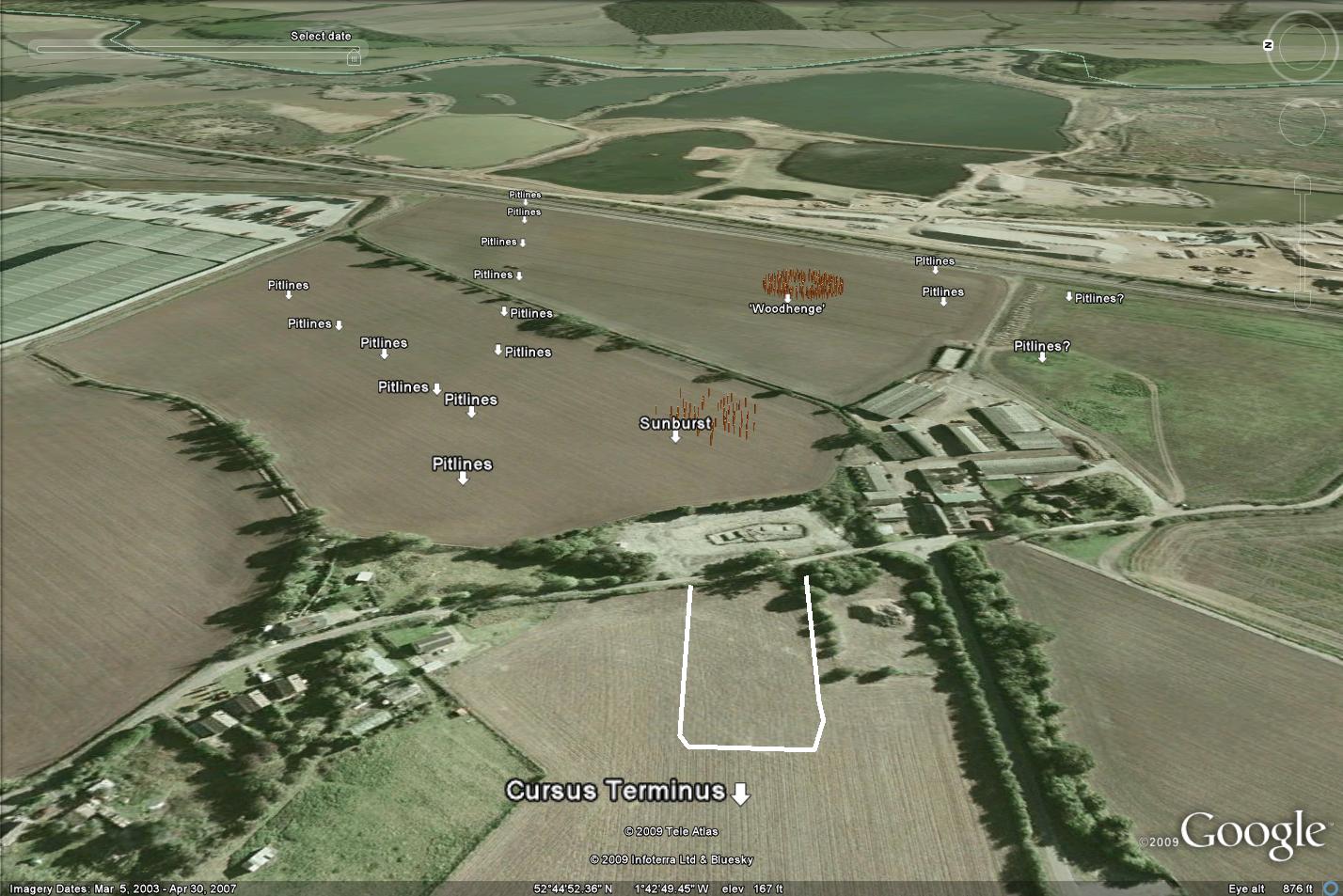 These two were not alone. The cropmark of a possible cursus monument lay 130m to the west. Aligned east–west and at least 110m long, it points towards the Sunburst Monument; only the western terminus survives, where it is 45m wide. To the east, on islets within the network of branching and reconnecting streams of the floodplain, two possible hengiform monuments have been identified on aerial photographs, at Fatholme and Borough Holme.