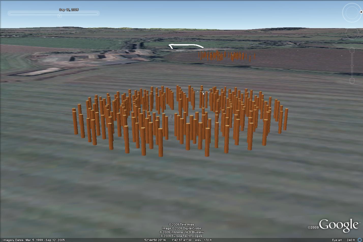 At the Woodhenge Monument we excavated 23 pits, some from each of the five rings. They were around a metre in diameter and in places over a metre deep, and straight-sided. Three contained the remains of oak timbers (flecks of charcoal and dark soil stains), confirming the morphological suggestion that they once held uprights, presenting something of a forest – a total of 195 tall posts in five rings each of 39. As well as the circular arrangement, the pits effectively form 32 radiating lines, comparable to the 12 lines at the Sunburst Monument.