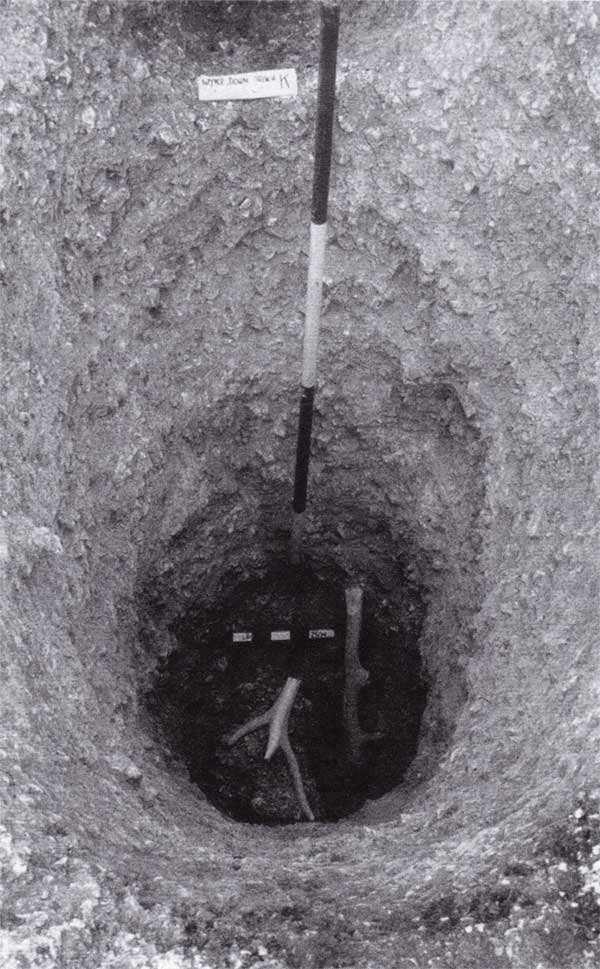 The sequence shows that at this point small pits were excavated in the top of the rubble and a number of ritual elements included. These differed from those lower down, with no antler or carved chalk present, but instead contained much Grooved Ware pottery and occasional small amounts of human bone. The upper deposits were covered over and subsequently a clayey silt naturally accumulated in the tops of the pits which contained sherds of Late-Style Beaker pottery and pieces of Collared Urn.