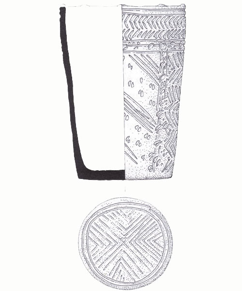 Bearing decorative motifs from all three main styles of Grooved Ware it additionally had an externally decorated base and small pellets applied at intervals to the rim. Carbonised food residues adhered to the inside. On the floor of the north-western terminal pit some scraps of Peterborough Ware were retrieved (an unusual occurrence with Grooved Ware) and on the base of another pit was a small carved chalk ball. No recuts were present and the lower secondary fill contained a rich deposit of Grooved Ware, worked flint and a little daub on the north-west side nearest to the buildings discussed on pages 73-5, suggesting contemporaeity (refers to the pages in the book ‘A Landscape Revealed – 10,000 Years on a Chalkland Farm‘).