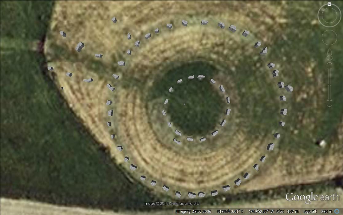 Two concentric circles of stones & 4 circles of postholes with a common centre, excavated in 1930 by Maud Cunnington. Although these features are no longer visible in their original form, their locations are marked by concrete blocks. Beaker & Peterborough Ware sherds, flint petit tranchet derivatives and lava. The outer stone circle had a diameter of 40m and originally included 42 sarsen stones. The inner stone circle was 15m across and contained 15 or 16 stones. The four timber circles varied in size from between 5m and 21m across and contained between seven and thirty-three posts.