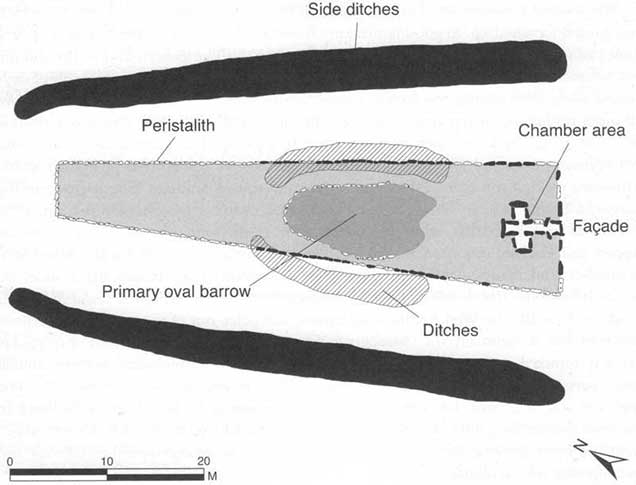 The first structure on the site was an oval mound about 14m by 7m with a pair of flanking ditches. The mound was delimited by a stone kerb and at the southern end there was a timber chamber flanked at either end by massive D-shaped posts. The chamber was about 4.6m long and about 1m wide. On the floor were the disarticulated remains of at least 14 individuals, mainly adult males. Nothing of this early structure is visible today, because around 3500 BC a much larger barrow was constructed over the top, completely encapsulating it. This is the classic long barrow visible today.