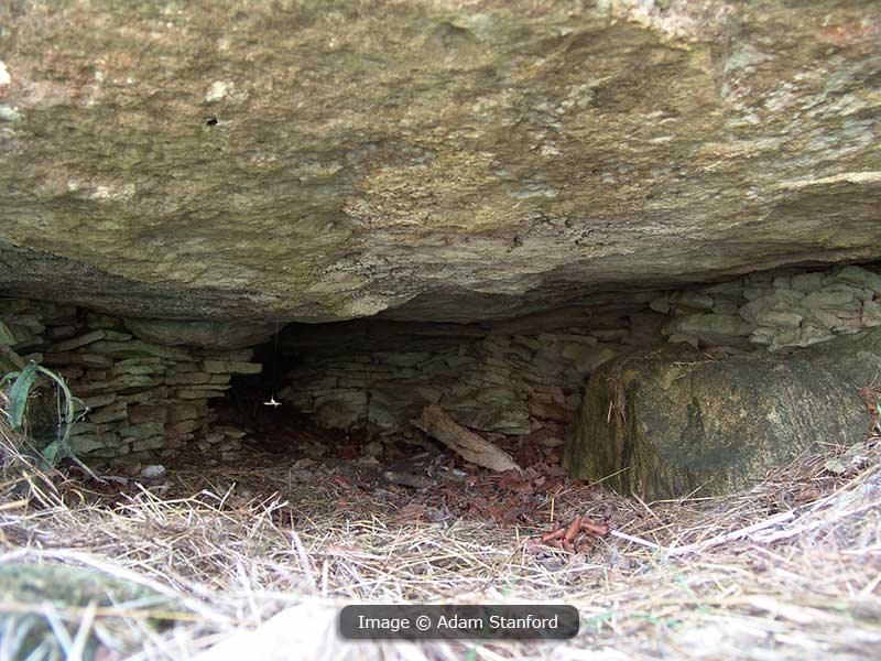 Sadly, none of these details are visible today, although the position of the chambers can be seen. In 1987 gales brought down a beech tree on the barrow revealing a third chamber in the northwest sector of the mound. Others may well await discovery.